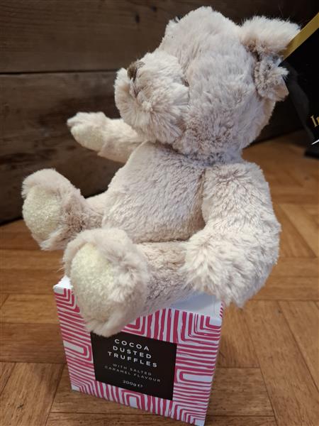 Complete your gift with a super soft teddy and a delicious box of cocoa dusted truffles.