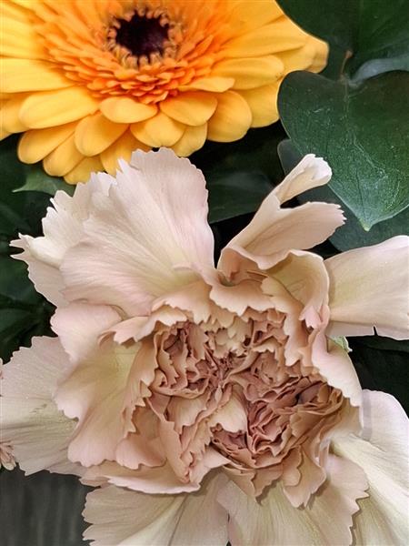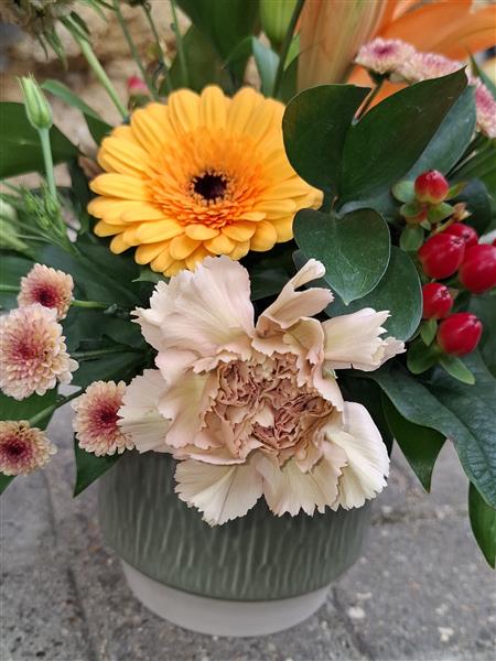 A delightful, compact arrangement in shades of orange and yellow, using toning foliage's and materials to complement - created into a container for ease of display for the recipient