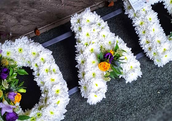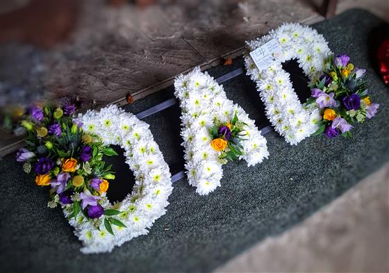 A variety of colours can be requested for ribbon and spray mount - white chyrsanthumums are usual for the base of the letter