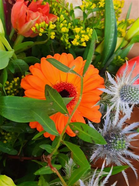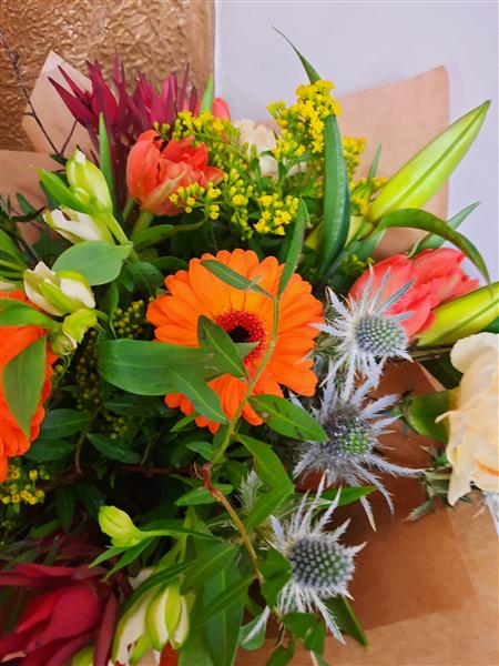 Peaches, rusts and reds combine with autumnal foliage to create this timeless hand-tied bouquet.